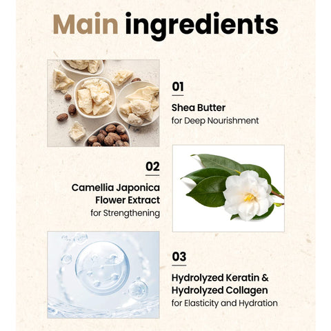 Cetyl Alcohol, Behentrimonium Methosulfate, Water, Butylene Glycol, Cocos Nucifera (Coconut) Oil, Butyrospermum Parkii (Shea) Butter, Argania Spinosa Kernel Oil, Camellia Japonica Flower Extract, Sapindus Trifoliatus Fruit Extract, Simmondsia Chinensis (Jojoba) Seed Oil, Macadamia Ternifolia Seed Oil, Titanium Dioxide, 1,2-Hexanediol, Hydrolyzed Keratin, Hydrolyzed Collagen, Sodium Hyaluronate, Caprylyl Glycol, Honey, Fragrance